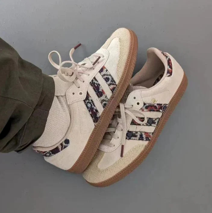 This edition features an ecru suede upper, complemented by a tone-on-tone hemp mudguard. Colorful patterns decorate the three stripes with frayed finishes, as well as the heel tab. Golden branding on the tongue and side panels adds a premium touch to the silhouette, while the whole design is completed with a traditional gumsole.